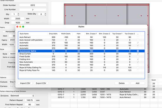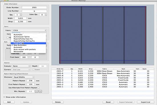 ParaSol has a fabric database which can be edited directly in ParaSol or imported as a CSV file from your order management system. Fabric widths, fabric orientation rules, stripe widths and positions, creasing or marking, cut speed and pressure… all these details are saved in with the fabric so selecting one, sets everything right down to when it's cut.
