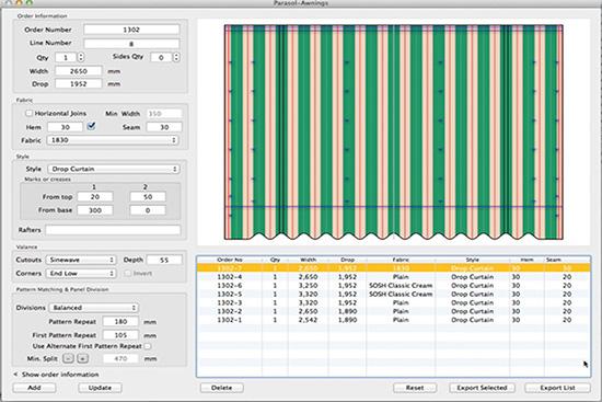 ParaSol Awnings makes vertical seam position and fabric widths easy. Plain or striped fabric patterns are generated in seconds with a minimum of input whether you're looking for appearance or economical use of fabric.