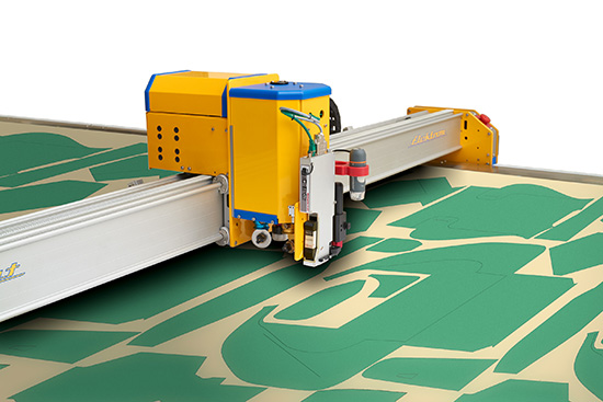 Most sheet materials like foam, flexible plastic and cardboard are cut with a tangentially steered knife, either static drag blade or a reciprocating or oscillating blade.
