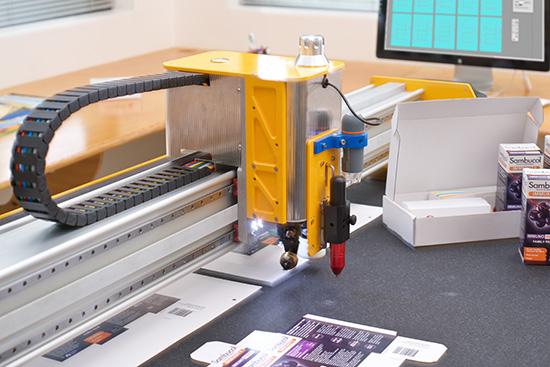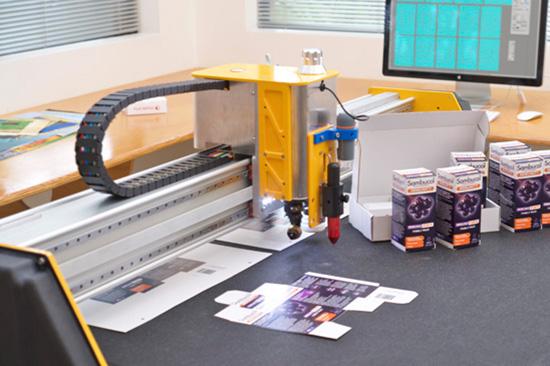 The Mikron 2 was designed for packaging and is as home in the design office as in short run boxes where the cost difference between a Mikron 2 and the competition is enough to make a business profitable. For packaging work, the Mikron 2 uses a plunge knife, creasing tool and Cyclops camera for registration mark recognition.