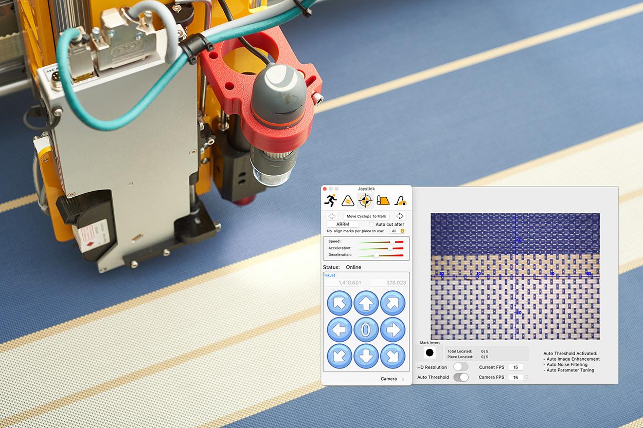 Cyclops is a gantry mounted machine vision systems which lets the cutter operator see a detailed live view of exactly what's below the cutting head. Cyclops can be used for aligning; patterns in the nesting queue are moved to align with what's on the cutting table. That's the efficient way of doing it.